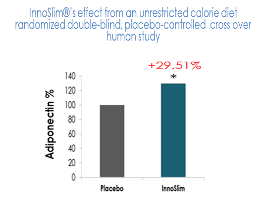 人體臨床實驗結果顯示,針對身體質量指標 (Body Mass Index, BMI) ≧ 27,但不高於35或體脂肪(Body fat)≧30%的人群,在飲食不作任何改變的情況下,每日服用250mg的茵若纖,能讓血液中的脂聯素濃度增加30%。
